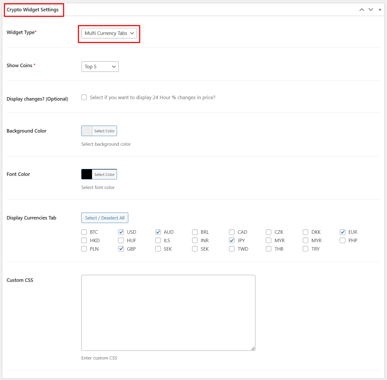 • Widget Type: Choose Multicurrency Tabs from the available widget type options.