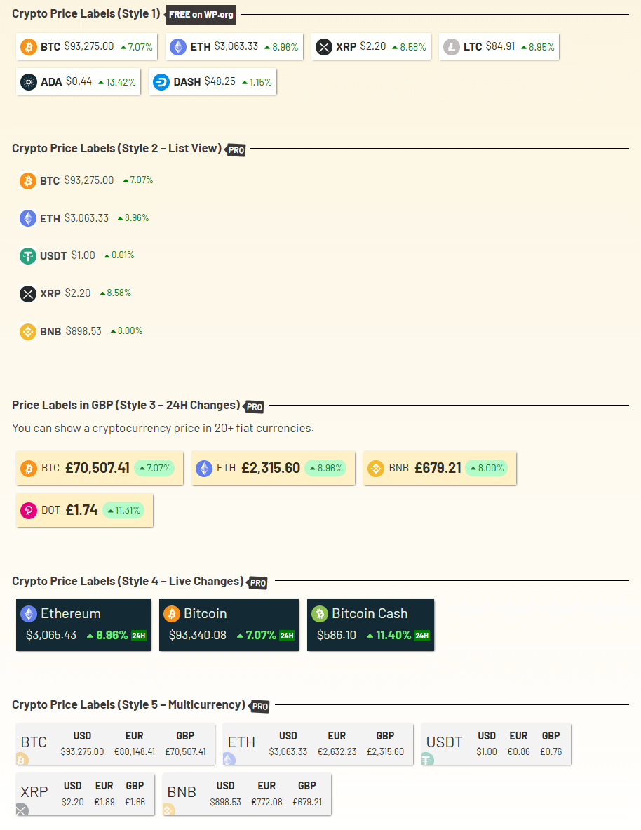 Using Cryptocurrency Widgets Pro, you can easily create a price label widget and then add it anywhere on your page/post via shortcode.