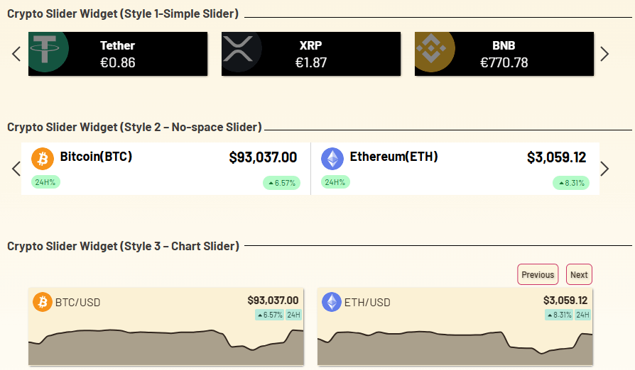 The Slider Widget allows you to display cryptocurrency prices in an auto-moving slider format on your WordPress website. It shows coin names, prices, and other important details in a scrolling layout, perfect to highlight multiple coins in a compact space without using a long list or table.