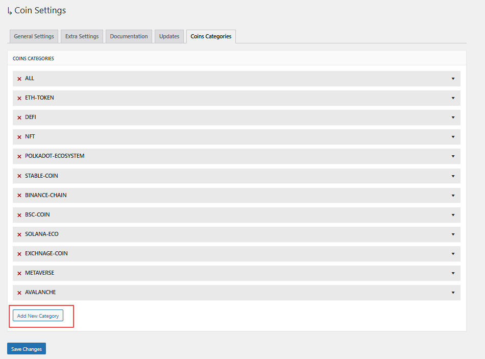 - The Coin Settings Panel will open, click Add New Category.