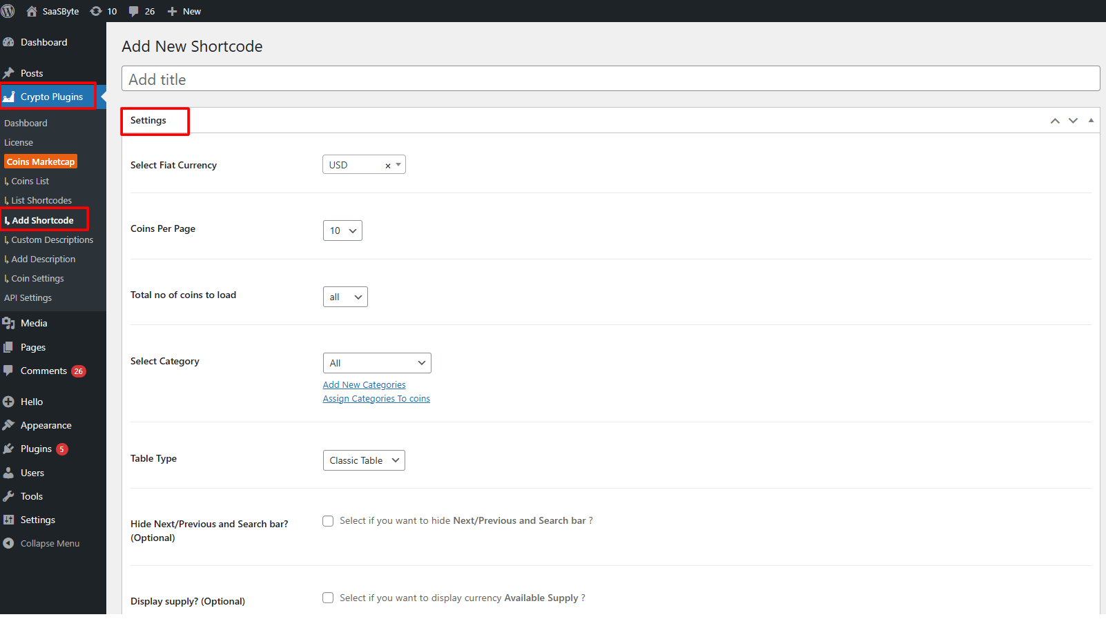 - From your WordPress dashboard, navigate to Crypto Plugins > Coins MarketCap > Add Shortcode.
