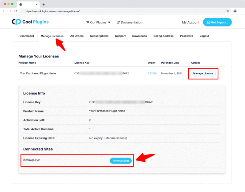 - Click “Manage License” next to your key.