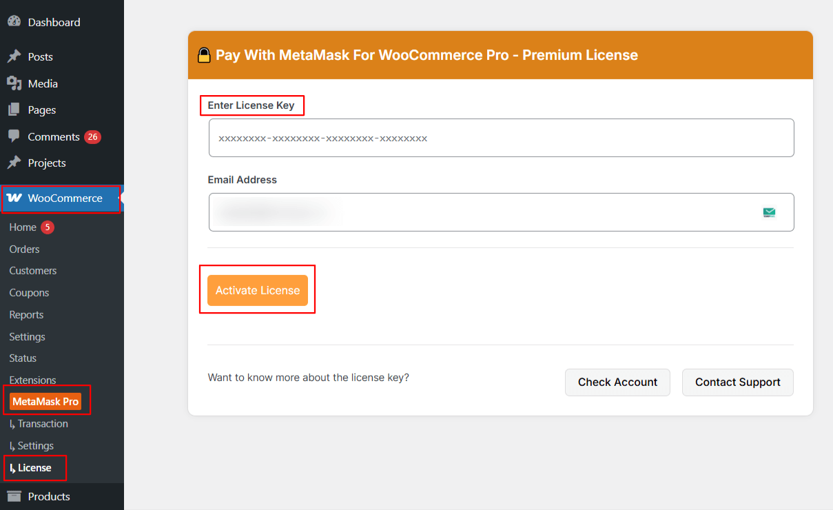 - Navigate to WooCommerce > Metamask Pro > License.